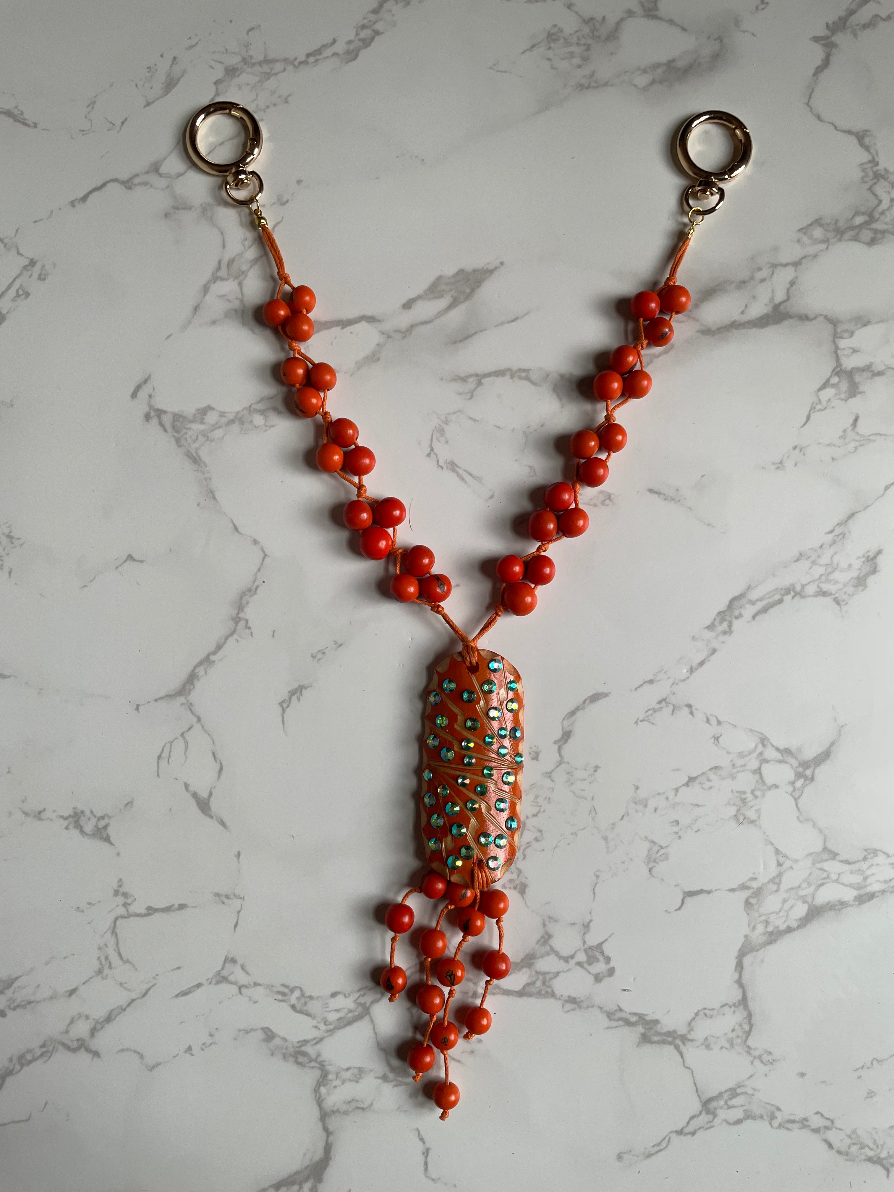 The Lucky Ember Relic is the bold centerpiece of the capsule. A vibrant sculptural pendant, wrapped in shimmering crystals, anchors strands of orange beads that cascade below.